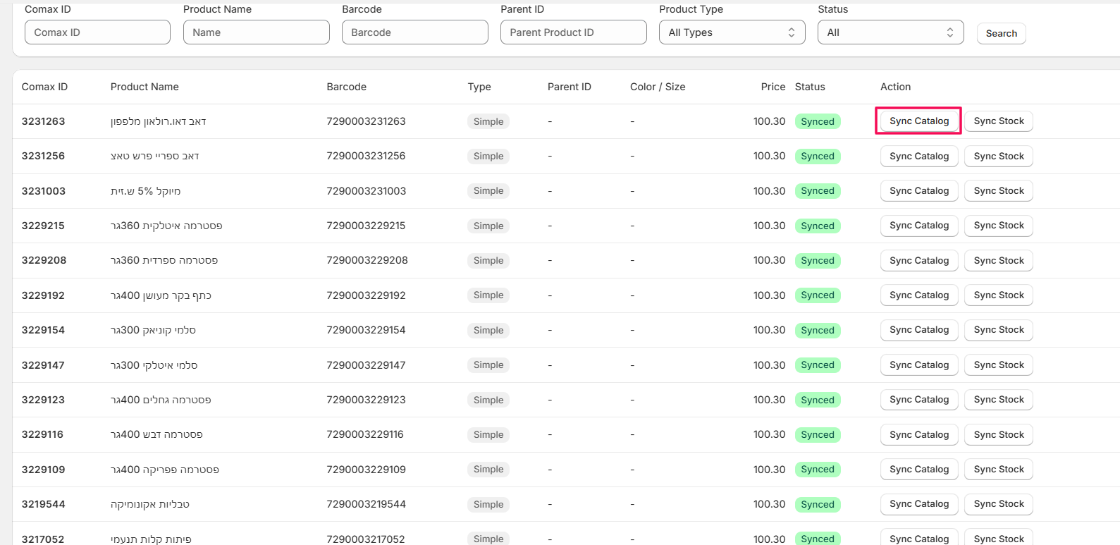 • In the product row, click Sync Catalog.