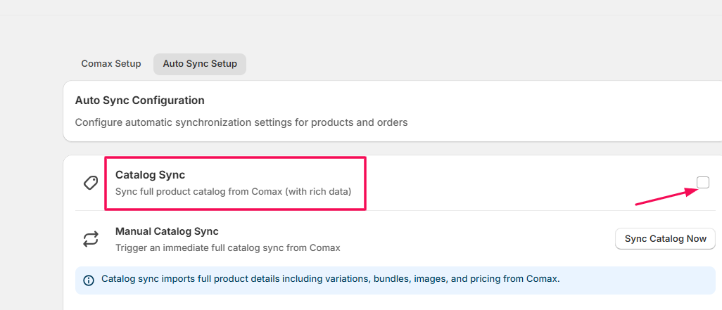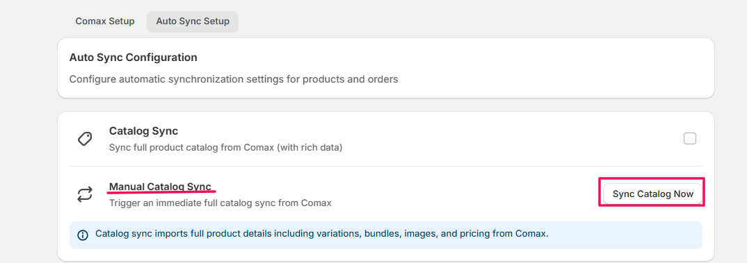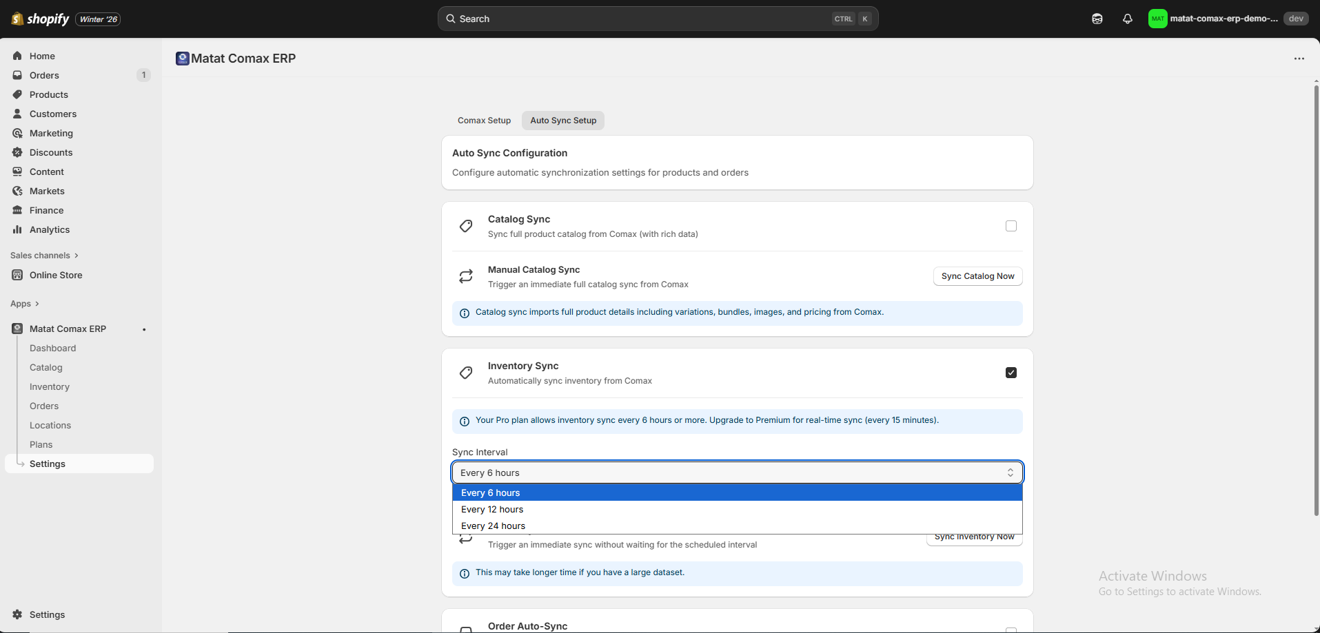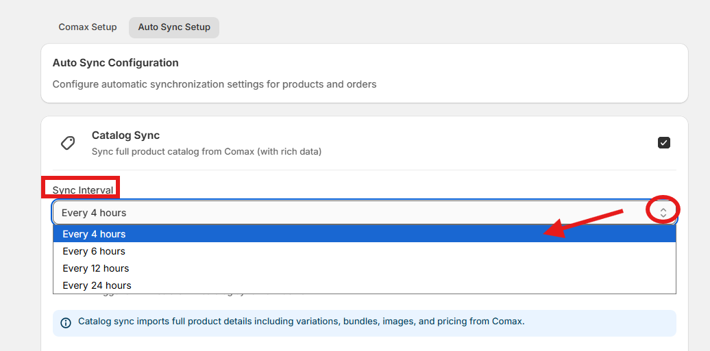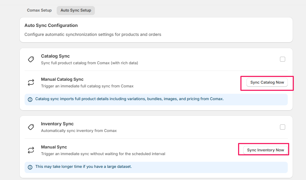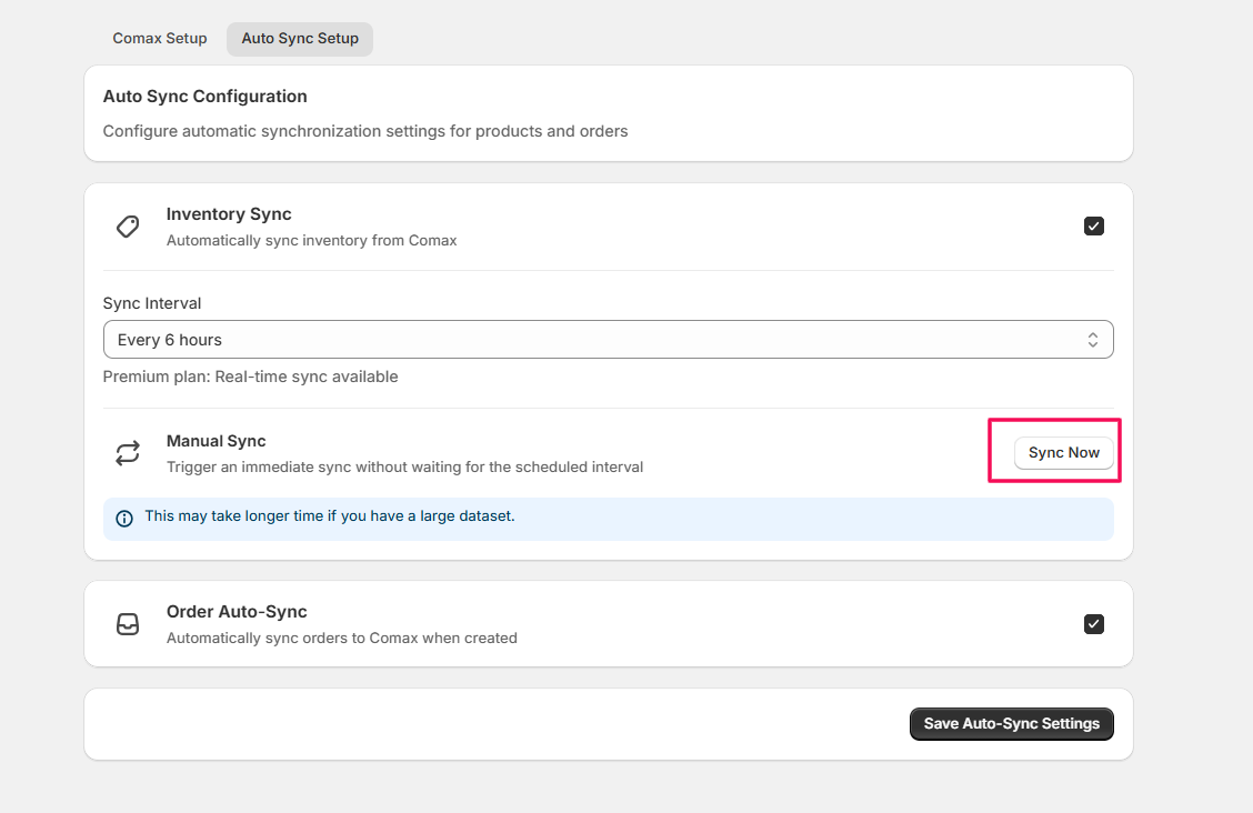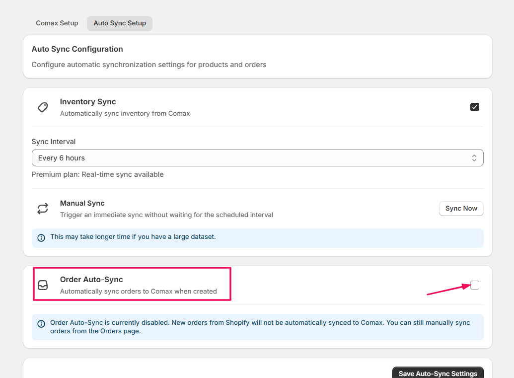 Note: Enabling auto-sync ensures that your Shopify store and Comax data (inventory and orders) are always up-to-date without manual intervention.