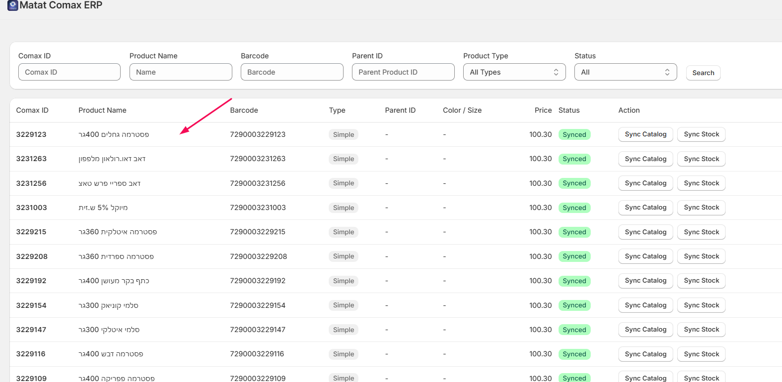 • Once the sync is finished, the action status will be updated, and the Comax ID (document number provided by Comax) will appear in the list.