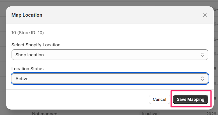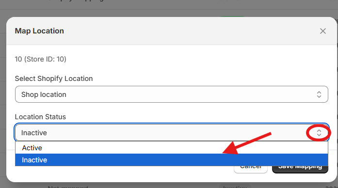 Note: Only those inventory items with an active, mapped location will be synced into Shopify. Mapped location but no active status will be ignored during the sync process.