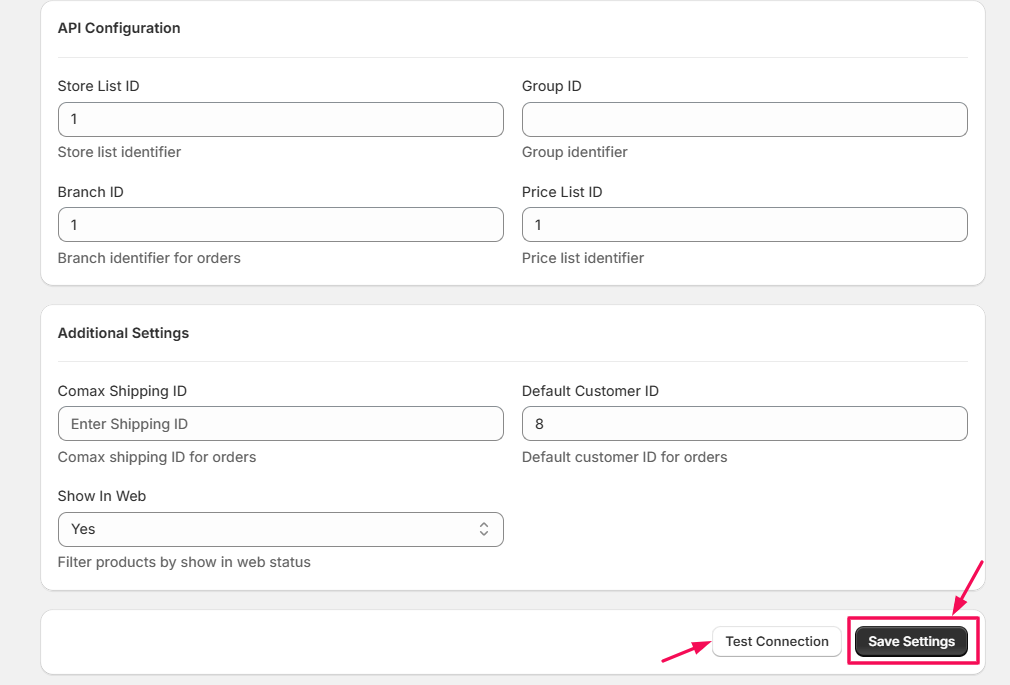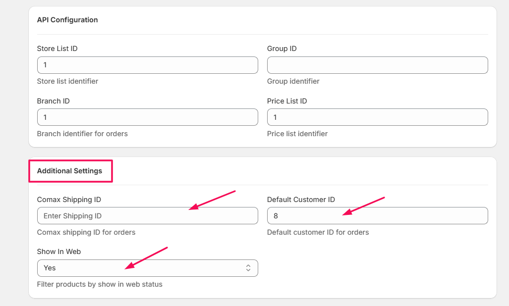 • Store ID List: Identifies the specific Comax stores whose inventory and product data will sync with Shopify.