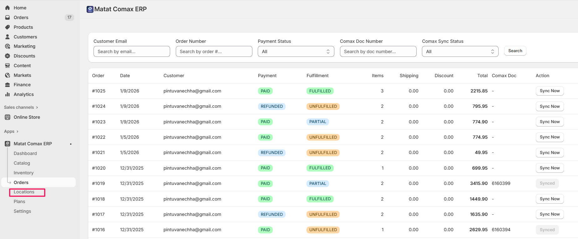 • Click Sync Now to sync that order with Comax.