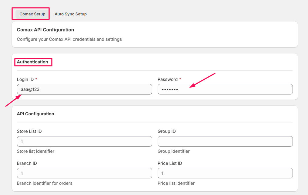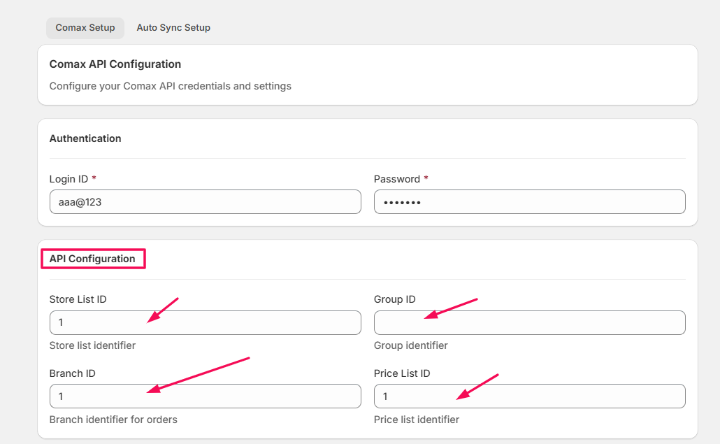 • Price ID List: Defines which price list from Comax should be applied to the synced products (e.g., retail price, special pricing).