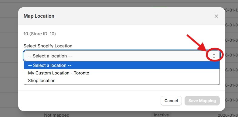 • Click the dropdown and choose the correct Shopify location.
