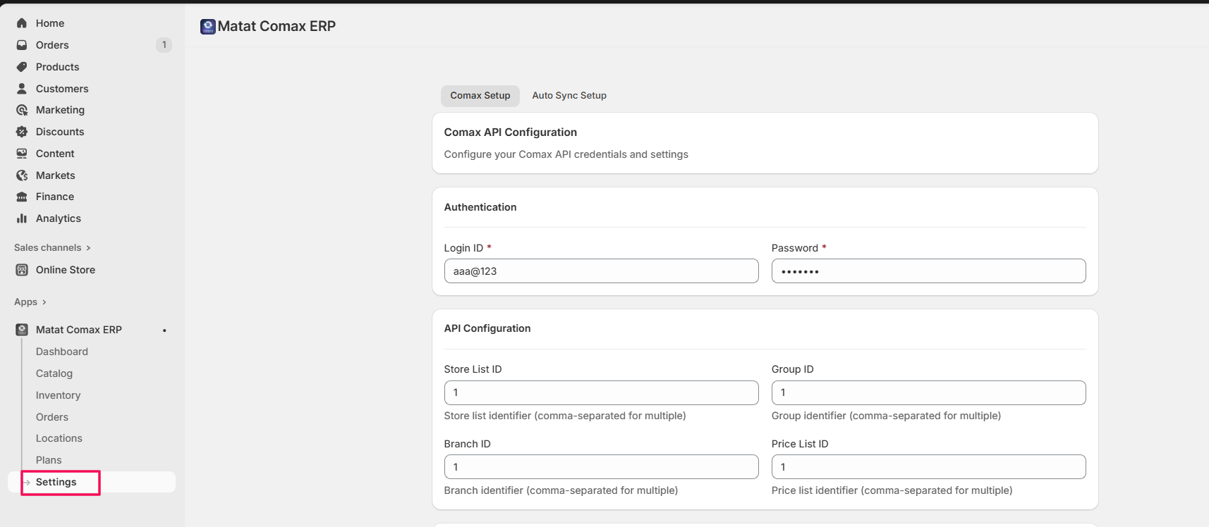 • Check the Order Auto-Sync box to sync newly created orders to Comax automatically.
